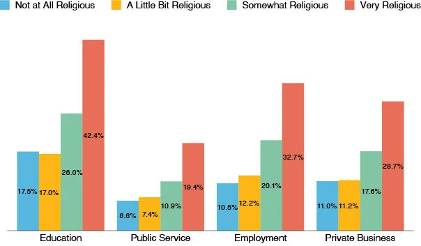 Nonreligious participants living in very religious communities were nearly 2.5 times more likely to experience negative events in education than in nonreligious communities, nearly 2.5 times more likely to experience negative events in public services (for example, voting, jury duty, poll work), more than 3 times more likely in employment, and more than 2 times more likely when dealing with private businesses. Moreover, participants living in very religious communities experienced nearly 40% more stigma than those in not at all religious communities.